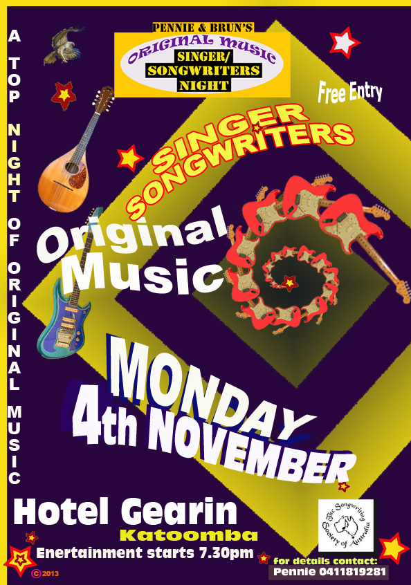 Next Pennie and Brun's Singer Songwriters night at the Hotel Gearin, Katoomba is Monday the 2th December 2013